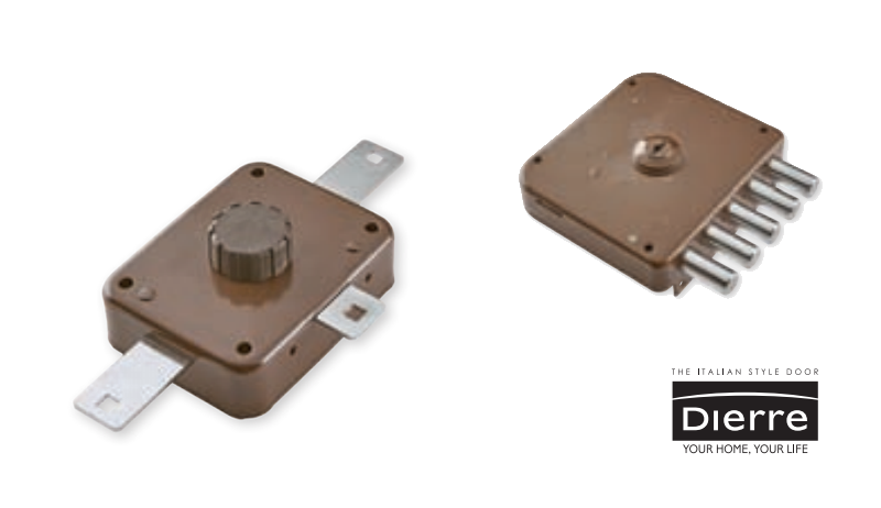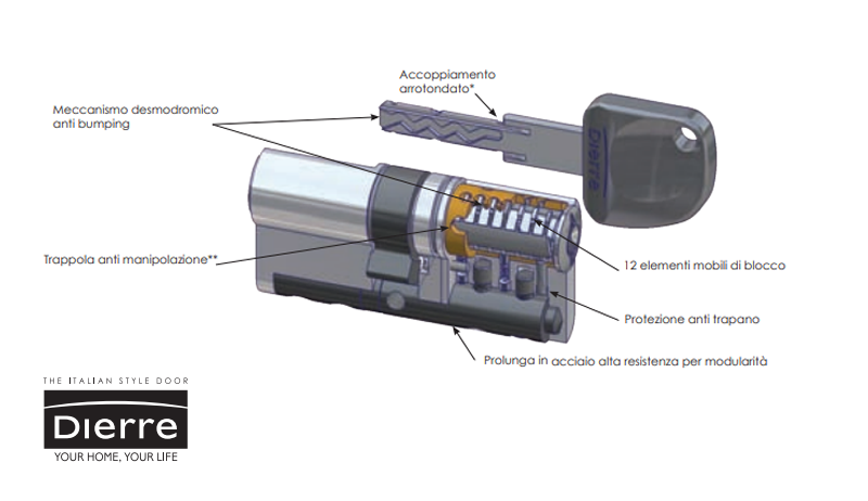 As fechaduras Dierre garantem proteção para todos os casos de intrusão ou de roubo, a todos os níveis, na medida em que possuem trancas, trincos e também canhões New Power ou D-UP, dois cilindros equipados com cinco chaves patenteadas, silenciosos e 100% antirroubo, antigazua, antiperfuração e antiextração.